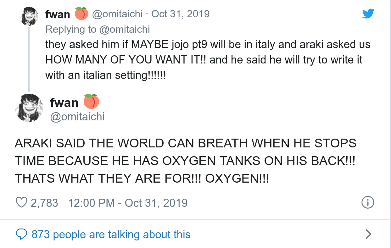 Durante uma convenção na Itália chamada de Lucca Games and Comics, o criador da série participou de um painel falando um pouco sobre a sua obra e tirando uma dúvida dos fãs sobre a habilidade de The World. Caso você não esteja familiarizado, The World possui como principal poder a capacidade de parar o tempo rapidamente, permitindo apenas que ele e Dio se movimentem durante esse período.